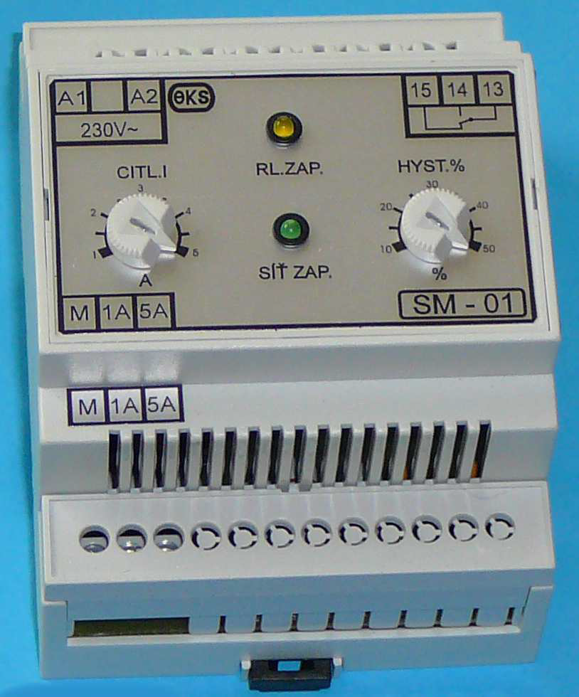 Proudové relé SM - 01 reaguje sepnutím výstupního relé ,pokud dojde k překročení nastavené velikosti vstupního (kontrolovaného) proudu.Zařízení je dvourozsahové (1A a 5Aa)