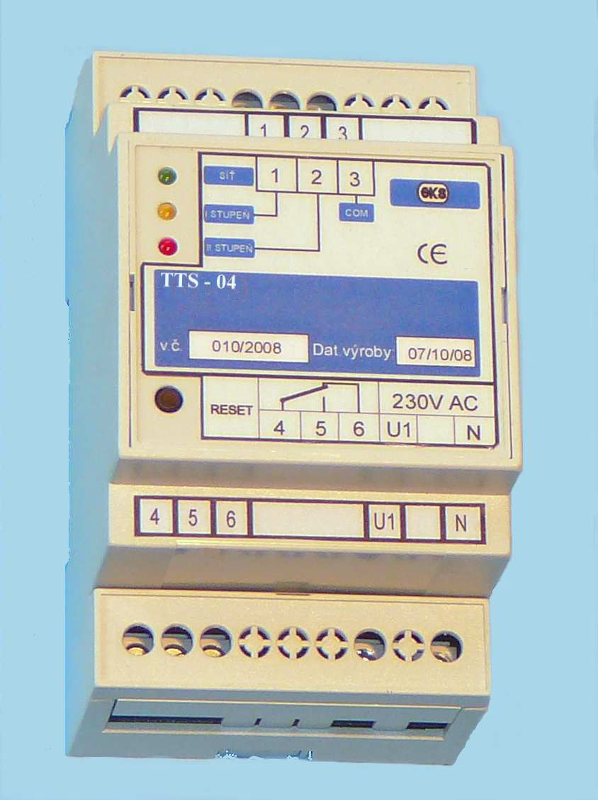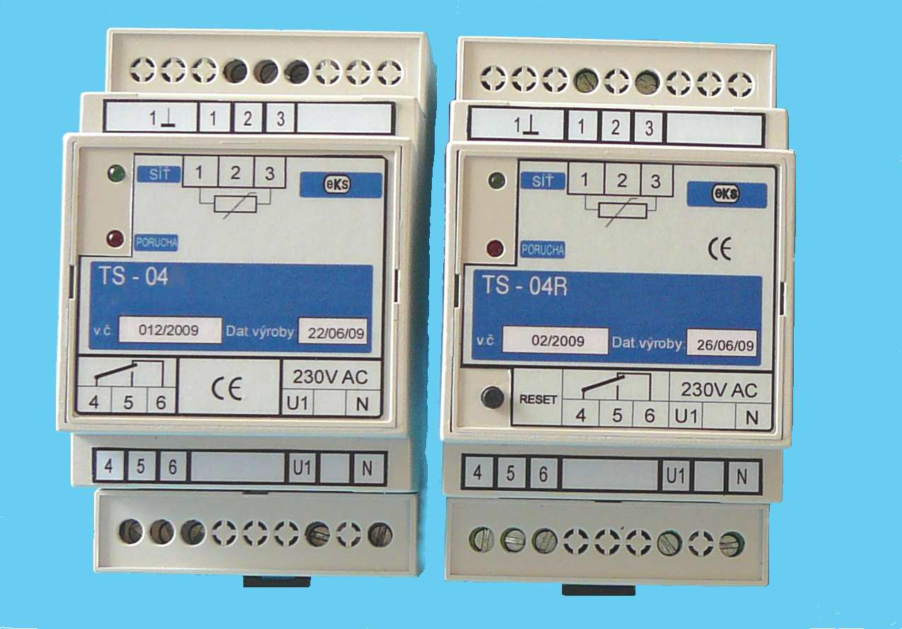 TVS-04 a TVS-04R jsou sdružené vyhodnocovací jednotky pro PTC odpory , bimetalové tepelné ochrany a vlhkostní čidla elektromotorů. Obě jednotky mají shodné vlastnosti,TVS-04R je navíc opatřena pamětí pro poruchu "PŘEHŘÁTÍ"- pro opětovné uvedení do provozu po poruše je tato jednotka opatřena tlačítkem "RESET". Jednotky jsou vestavěny do skříňky MODULBOX fy ITALTRONIC šířky 3M pro montáž na DIN lištu