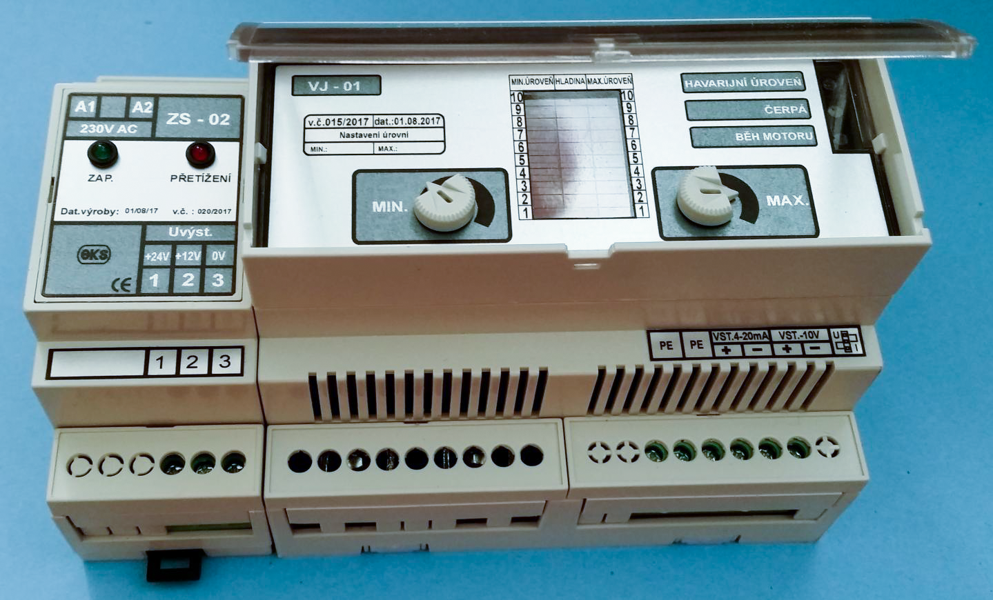 Zobrazovací a vyhodnocovací jednotka pro snímače výšky hladiny s výstupním signálem 4 - 20mA nebo 0 - 10V.Umožňuje udržovat výšku hladiny v nádržích nebo zásobnících ve zvolených mezích pomocí výstupu, ovládajícího čerpadlo.Lze zvolit režim "V" odčerpávání - čerpadlo je zapnuto, při dosažení nastavené max.výšky hladiny a vypnuto,klesne-li hladina na nastavenou minimální úroveň,nebo režim "P" plnění - čerpadlo je zapnuto pokud hladina klesne na nastavenou min.hladinu a vypnuto,pokud hladina dosáhne nastavenou max.výšku. Modul lze použít i pro měření a ovládání jiných veličin (teploty,tlaku aj.)pokud budou použité snímače mít uvedené výstupní signály.